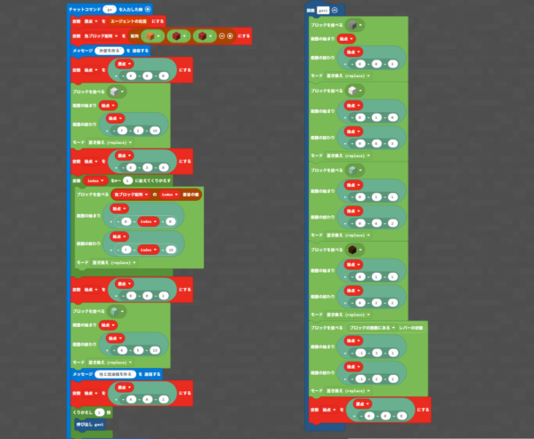 そんな発想から、繰り返し処理を使って効率よく建築していきます。最初は仕組みを理解するのに時間がかかりますが、自分自身プログラミングを作成していくうちに理解力が上がっていきます。